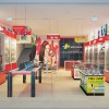 Đi sâu vào phía trong là khu vực quầy thu ngân. Quầy thu ngân hình hộp chữ nhật cao 1m2, rộng 1m7 đủ cho người bán hoạt động bán hàng. Phía sau là bức tường được ốp gạch đen bóng có kèm theo tên thương hiệu của cửa hàng:" ABC Shop" độc đáo và đẹp mắt.