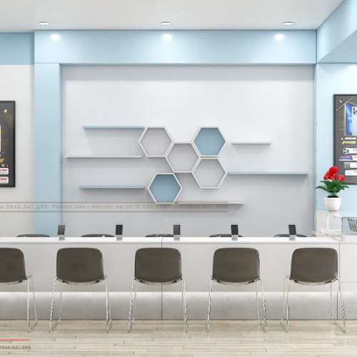 Tổng thể bố cục nội thất shop điện thoại khá đơn giản nhưng vẫn đáp ứng được công năng sử dụng. Khu vực quầy lễ tân bằng gỗ MDF phủ melamine màu được đặt cuối tiệm để nhân viên có thể quan sát tổng thể và giải quyết những tình huống bất ngờ xảy ra một cách nhanh nhất. Vách logo nằm phía sau quầy lễ tân để người tiêu dùng dễ dàng nhận diện thương hiệu cho shop. Khu vực xem sản phẩm và chờ đợi được bố trí song song tận dụng tối đa không gian và để tạo được lối đi đủ rộng cho khách hàng.