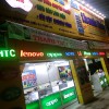 Mặt tiền của mẫu thiết kế shop điện thoại được đầu tư rất nhiều. Bảng hiệu alu vàng chữ mica in nổi các thông tin chi tiết, hộp logo phát sáng kèm theo đó là hệ thống đèn rọi phía trên chiếu sáng cả mặt tiền.