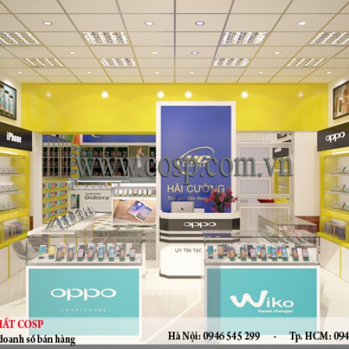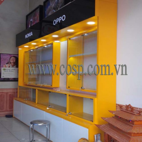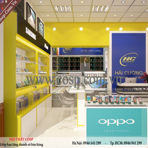 Thiết kế cửa hàng điện thoại với màu vàng đem đến một không gian cửa hàng điện thoại tươi sáng, rạng rỡ. Màu cũng hợp phong thủy với gia chủ nên rất thích.