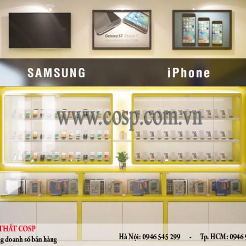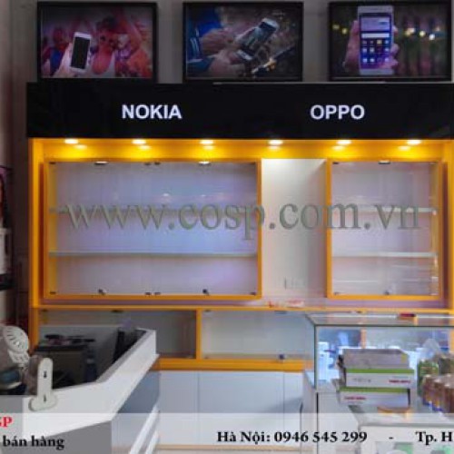 Hệ thống tủ kệ trưng bày trong shop điện thoại được bố trí hợp lý để đảm bảo có lối đi lại thông thoáng, thoải mái cho khách hàng. Lối đi lại trong cửa hàng là rất quan trong, nó giống như các mạch máu trong cơ thể con người vậy. Lối đi lại quá nhỏ sẽ gây ra tắc nghẽn, khách hàng không di chuyển được trong cửa hàng thuận lợi sẽ thấy khó chịu và muốn rời đi. Các trán tủ được gắn thêm các tranh backlist, các đèn led để không gian cửa hàng điện thoại sinh động và rạng rỡ hơn.