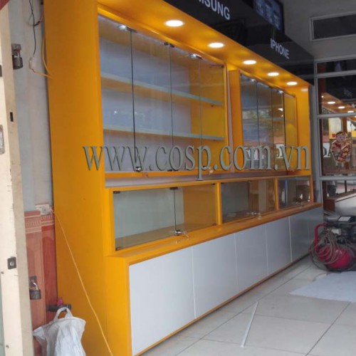 Kính cường lực được sử dụng để làm mặt và cửa tủ trưng bày có khả năng chịu lực cao gấp 5 lần kính thường nên sẽ khó bị vỡ hơn. Dưới đây là một số hình ảnh tại cửa hàng điện thoại của anh Cường sau khi thi công nội thất cửa hàng hoàn thành: