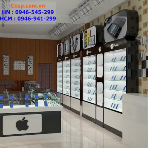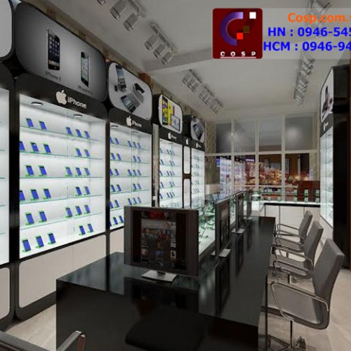 Nội thất shop điện thoại có màu trắng và đen rất sang trọng và sạch sẽ. Hệ thống kệ trưng bày sát tường được làm bằng gỗ MDF phun sơn, bên trong phun sơn trắng, bên ngoài sơn đen. Đây là 2 màu tuy đối lập nhau nhưng khi kết hợp lại tạo được nét quyến rũ.
