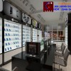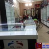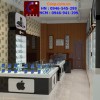 Trở lại với mẫu thiết kế shop điện thoại, các bạn có thể thấy những tủ sát tường rất cao, chúng có các đợt bằng kính rất sang trọng và trang bị đèn led trong tủ rất tiện lợi.