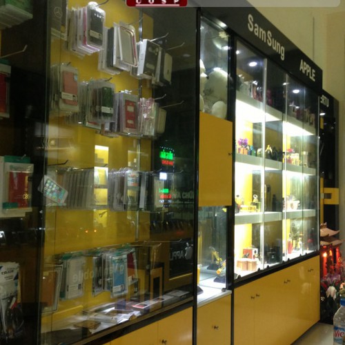 Tông màu vàng và đen chính là màu chính của nội thất shop điện thoại anh Dũng. bạn có thể thấy được sự nổi bật ngay từ bên ngoài khi nhìn qua lớp cửa kính cường lực trong suốt. Màu vàng hợp phòng thủy cũng sẽ đem lại danh lợi cho gia chủ.