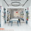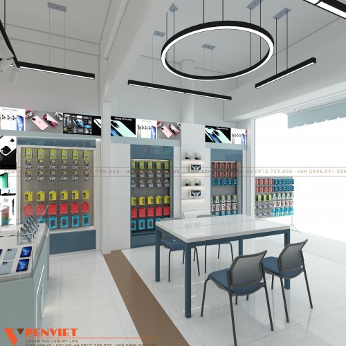 PenViet lựa chọn màu trắng làm gam màu chủ đạo cho không gian giúp tôn lên điểm nhấn màu xanh pastel. Việc lựa chọn gam màu sáng ngoài mang đến hình ảnh chuyên nghiệp cho mẫu thiết kế shop điện thoại, nó còn có vai trò giúp ánh sáng phản xạ và luân chuyển tốt hơn, khiến cửa tiệm trông rộng rãi, thông thoáng.