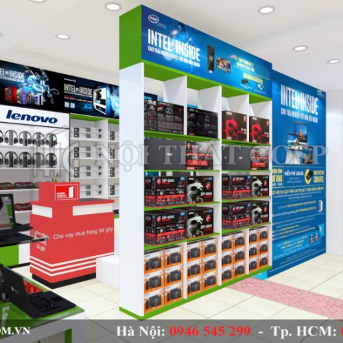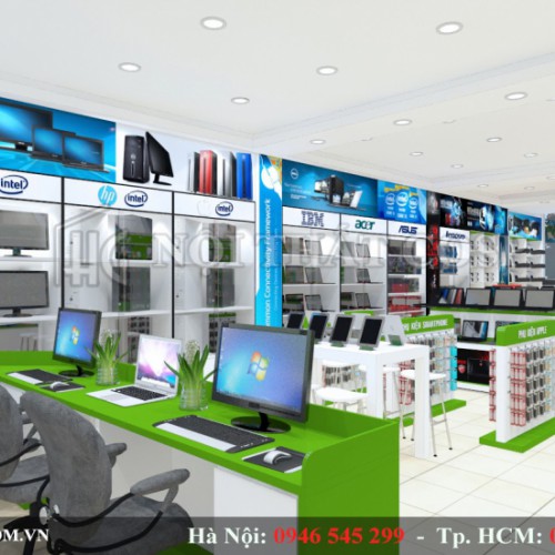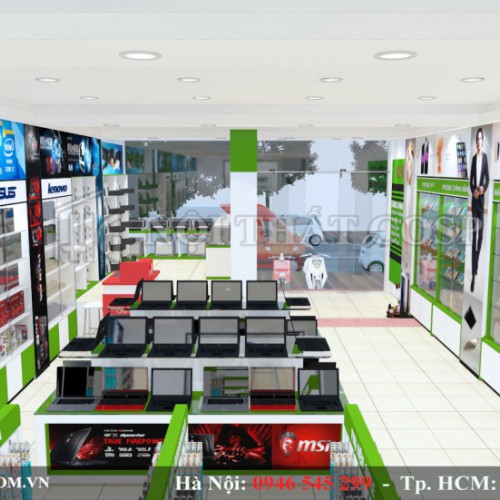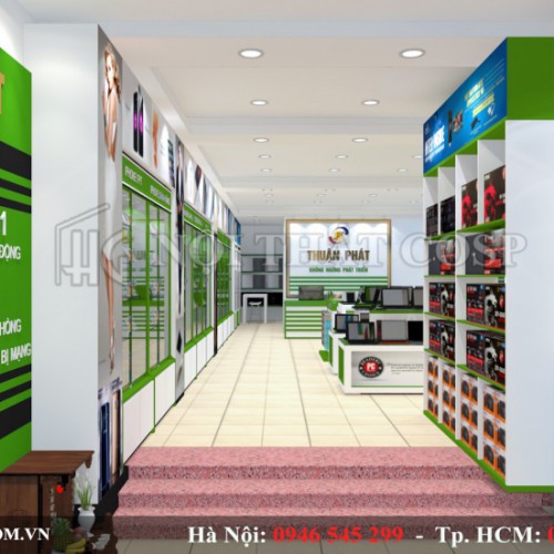 Thiết kế cửa hàng máy tính - điện thoại Thuận Phát ngoài sử dụng màu sắc linh hoạt thì các tấm tranh backlit film bắt mắt được tận dụng triệt để. Chủ đề rất phong phú và đa dạng, từ người mẫu thương hiệu, các sản phẩm công nghệ cho đến các chương trình khuyến mãi đều được đầu tư chuyên nghiệp.