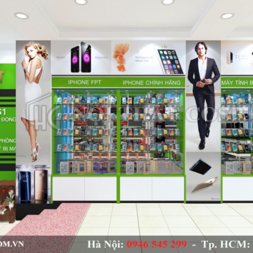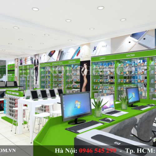 Các kệ đặt tại trung tâm cửa hàng chủ yếu là kệ thấp độc lập bố trí theo chiều từ thấp đến cao. Đối với tủ lớn, móc treo được thiết kế cho từng tủ dùng cho mục đích trưng bày các loại phụ kiện điện thoại. Cách sắp xếp này không chỉ chiếm ít diện tích mặt bằng đồng thời còn tạo ra khoảng không thông thoáng và thoải mái cho khách hàng khi sử dụng dịch vụ cũng như mua sắm sản phẩm trong shop.