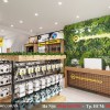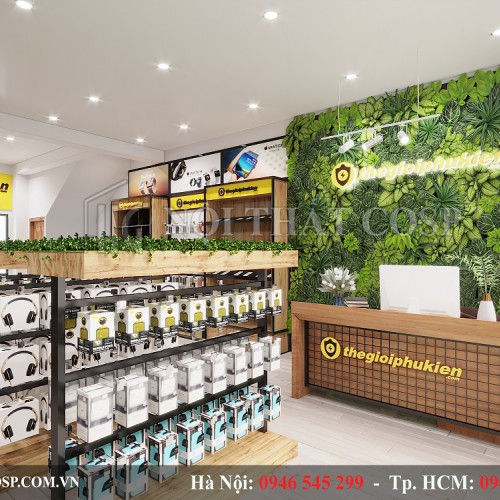 Phong cách gần gũi vỡi thiên nhiên được áp dụng rất nhiều tại nhiều không gian của mẫu thiết kế cửa hàng điện thoại. Mẫu thiết kế shop điện thoại thoại của anh Toàn đã sử dụng những tấm thảm cỏ nhân tạo để làm vách logo độc đáo và thu hút. Cảm giác được sự gần gũi, lòng hiếu khách chính là cảm xúc của khách hàng.