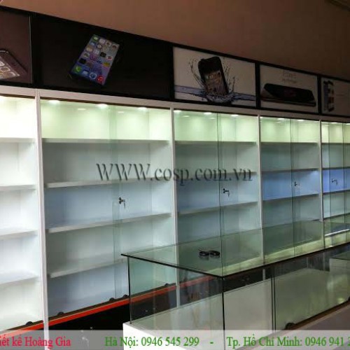 Cánh cửa lùa có khóa, bên phần trán tủ dán tranh backlist xuyên sáng thu hút khách hàng, phía dưới là các ngăn tủ đựng đồ rất tiện lợi. Hệ thống tủ được đặt sát tường nên tiếp kiệm diện tích, có đèn led bên trong cung cấp ánh sáng cho những chiếc điện thoại ở bên trong sâu.