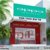 Tấm biển lớn ở mặt tiền nổi bật với logo và màu sắc trắng - xanh lá đặc trưng của hãng điện thoại Oppo là dòng sản phẩm điện thoại kinh doanh chính tại cửa hàng. Phía dưới tấm biển được sơn màu đỏ với ý nghĩa may mắn rất được người Á Đông yêu thích, đặc biệt trong lĩnh vực kinh doanh. Dòng chữ màu vàng đồng phát sáng với nội dung ngắn gọn về mặt hàng kinh doanh tại cửa hàng.