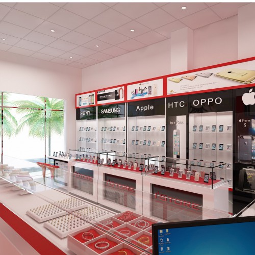 Nội thất shop điện thoại kiêm vàng bạc này rất biết cách sắp xếp. Những nội thất trưng bày điện thoại được kê sát tường còn những kệ tủ trưng bày giũa nhà là nội thất để trưng bày vàng bạc đá quý. Sự cao cấp của nội thất trưng bày vàng bạc cũng đã phần nào giúp phần không gian điện thoại sang trọng hơn. Từ đó cửa hàng trở nên thu hút khách hàng hơn.