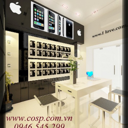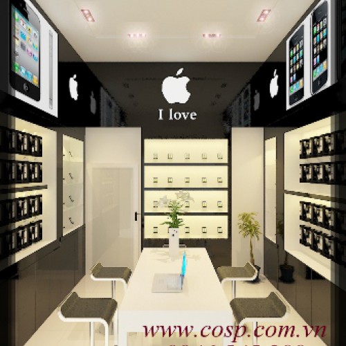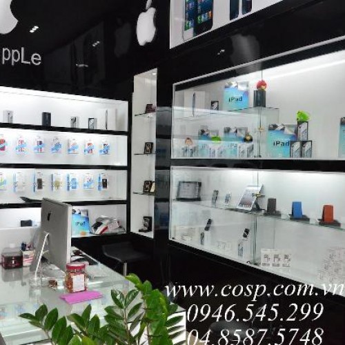 Cosp lên phương án ý tưởng và thi công nội thất, vật liệu chính sử dụng Mika Đài Loan tạo độ bóng và gỗ MDF sơn trắng cao cấp. Với kiểu design tôn lên thương hiệu apple bằng sự kết hợp 2 vật liệu cơ bản, với tông màu đen và trắng. Toàn bộ kệ tủ được xử lý chống nước ngập nên tới 30cm tính từ sàn nhà, đồng thời đảm bảo tính vững chắc cũng như tính thẩm mỹ.