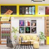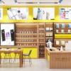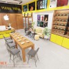 Bên cạnh những tủ trưng bày được bố trí các ngăn tủ phun sơn màu vàng nổi bật ở vị trí thấp giúp tăng không gian lưu trữ sản phẩm thì các mẫu tủ kết hợp cửa kính lại giúp mở rộng đáng kể khu vực bày bán sản phẩm.