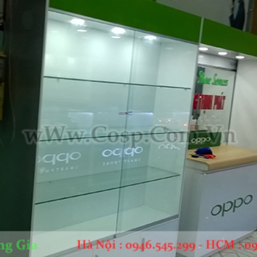 Kệ trưng bày sát tường có các đợt kính sang trọng, cửa kính lùa có khóa. Trán tủ dán tên các dòng điện thoại, bên trong có led phát sáng, chân tủ là hệ thống ngăn chứa đồ và phụ kiện điện thoại rất tiện lợi.