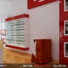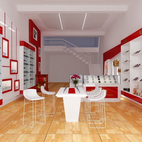 Ngoài ra, chất liệu kính được được ưu tiên cho các kệ ốp tường và mặt tủ quầy trưng bày giúp khách hàng thoải mái xem chọn sản phẩm qua từng ô kính. Các thiết kế cách điệu đa công năng trong việc trưng bày thiết bị động và trang trí cửa hàng.