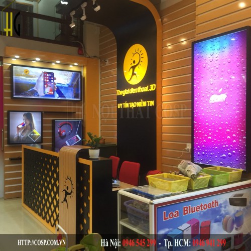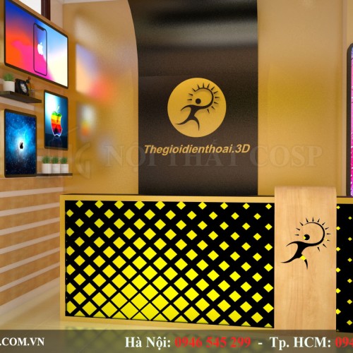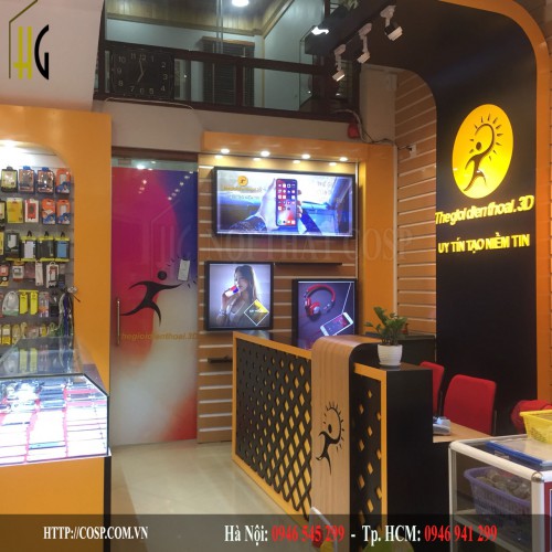 Diện tích 35m2 để thi công một shop điện thoại cũng không phải là một diện tích lớn. Anh Nhất chủ cửa hàng điện thoại lên ý tưởng muốn thiết kế cửa hàng điện thoại của mình theo màu sắc giống với thế giới di động. Nhưng để có những nét đặc trưng riêng của cửa hàng các chuyên gia thiết kế nội thất Cosp đã tư vấn cho anh Nhất nên thiết kế theo phong cách riêng của cửa hàng mình cũng như phù hợp với diện tích cửa hàng hiện tại đang có.