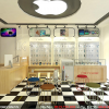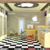 Không gian bên trong được trang trí bởi hàng loạt tranh backlist và logo iphone bắt mắt. Sàn nhà được lát đá hoa caro đen trắng làm không gian sinh động hơn.