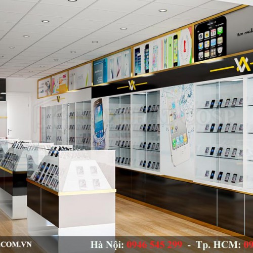 Sự sang trọng và chuyên nghiệp của mẫu thiết kế shop điện thoại được thể hiện nhiều ở nội thất, đặc biệt là những đường nẹp viền inox ở từng nội thất shop điện thoại. Màu vàng sang trọng bao quanh màu đen và trắng cao cấp tạo nên tổng thể một không gian vô cùng cuốn hút.