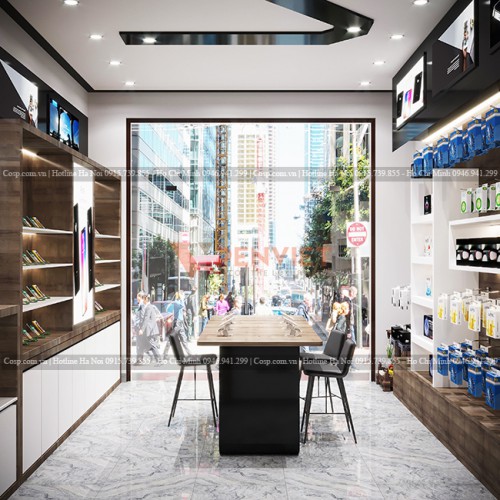 Sở hữu một diện tích không quá rộng đối với một thiết kế shop điện thoại, các kiến trúc sư của Penviet đã tư vấn cho khách hàng phong cách thiết kế hiện đại cùng gam màu nâu vân gỗ làm chủ đạo, kết hợp cùng màu đen trắng tạo chiều sâu cho không gian cửa hàng. Đây là những tone màu sẽ tạo ra hiệu ứng thị giác đặc biệt khi kết hợp khéo léo với nhau.