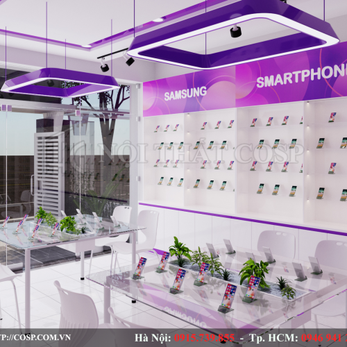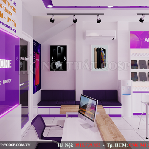 Bước chân vào cửa hàng bạn sẽ bị ấn tượng với lối thiết kế thông minh cùng với sắc tím nổi bật. Chúng tôi chọn màu tím là màu chủ đạo vì nó tạo ra cảm giác sang trọng và đẳng cấp, giúp không gian cửa hàng trở nên chuyên nghiệp uy tín hơn trong tâm trí khách hàng.