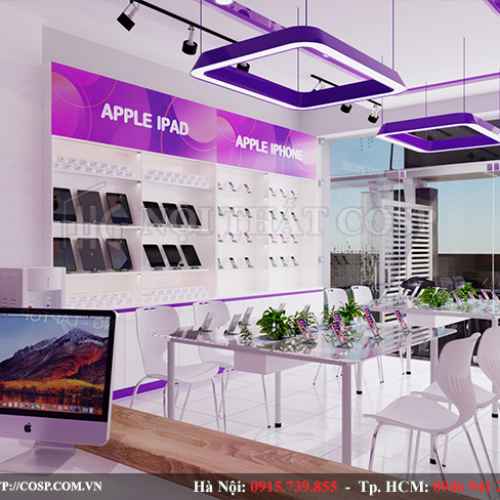 Hai bên tường được lắp đặt hệ thống tủ kệ trưng bày màu trắng với những đường viền và bảng hiệu màu tím. Những kệ trưng bày này được chia thành từng khu vực riêng biệt theo từng dòng sản phẩm như: máy tính bảng, điện thoại iphone, điện thoại smartphone, phụ kiện điện thoại,...
