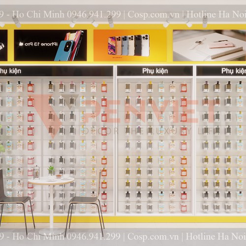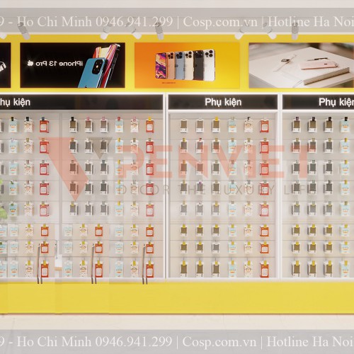 Nếu các tủ trưng bày điện thoại có thiết kế như vậy thì tủ phụ kiện có thêm một chi tiết khác nữa đó là móc treo. Móc treo kim loại nhỏ được gắn trực tiếp vào tủ để show ra các phụ kiện ốp, dây sạc, tai nghe của điện thoại. Ngoài ra mỗi tủ còn được gắn thêm tranh in blacklit theo mẫu để trang trí thêm.