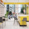 Bên cạnh đó, chúng tôi còn sử dụng thêm nội thất là một bộ bàn tiếp khách nhỏ cho thiết kế shop điện thoại T2 Apple này. Bộ bàn bằng chân sắt, mặt gỗ, tựa nhựa tạo nơi tiếp đón khách chu đáo hơn. Đèn rọi ray trên trần bê tông đi nổi cùng ốp alu màu vàng, tranh trang trí góp phần tạo nên vẻ đẹp cho thiết kế cửa hàng điện thoại.