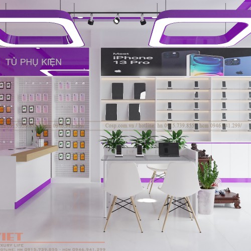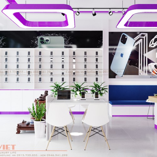 Về nội thất đương nhiên vẫn sử dụng những màu sắc như tím và trắng rồi. Trong các nội thất được bày trí, màu trắng sẽ là màu chủ đạo còn màu tím đóng vai trò là điểm nhấn cho nội thất shop điện thoại.