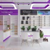Bàn trải nghiệm,quầy reception và ghế sofa được làm từ gỗ MDF phủ melamine sơn trắng xen kẽ là màu tím nổi bật. Nệm bọc vải, tựa khung gỗ. Ngoài ra, ghế ngồi cho khách và nhân viên làm bằng khung gỗ tựa nhựa hoặc chân sắt.
