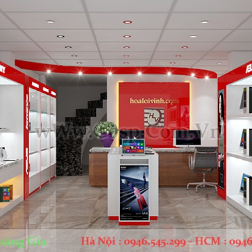 Tiếp đến là khu vực quầy thu ngân. Quầy thu ngân cũng rất quan trọng thể hiện hình ảnh của cửa hàng điện thoại. Vách logo càng đẹp, càng lung linh thì cửa hàng của bạn sẽ được khách nâng tầm nhận xét. Mẫu thiet ke shop dien thoai có vách logo đủ cuốn hút, quanh vách là đèn cuốn quanh rất đẹp.
