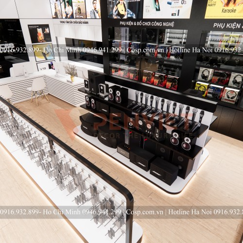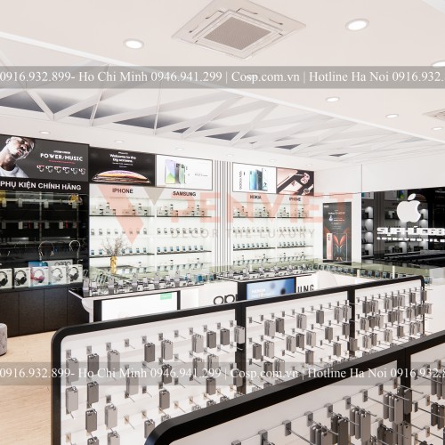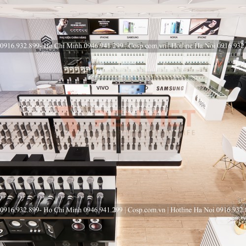 Thiết kế showroom điện thoại phải ưu tiên được sự trải nghiệm sản phẩm của khách hàng, KTS đã phân chia từng khu vực khá rõ ràng và đồng bộ trong thiết kế. Hầu hết các bộ kệ trưng bày đều được sử dụng gỗ MDF phủ melamine làm cho tủ bền hơn. Có khóa tủ kính để đảm bảo an toàn vì sản phẩm đều có giá trị. Trên mỗi kệ treo tranh gỗ, tranh in PP và những dòng chữ phù hợp với sản phẩm. Tủ trưng bày tai nghe đề dòng chữ “ Phụ kiện chính hãng”, “Phụ kiện & đồ chơi công nghệ”, khu để điện thoại thì có các hãng điện thoại như Iphone, Samsung, Nokia với rất nhiều dòng mấy. Làm cho không gian hài hòa và sinh động hơn.