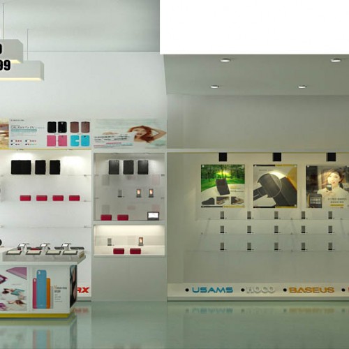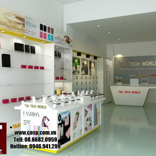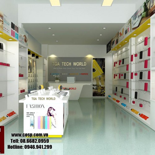 Ý tưởng thiết kế cửa hàng điện thoại, máy tính: Đặc thù cửa hàng kinh doanh đồ công nghệ cao nên không yêu cầu khả năng trưng bày cao mà cần nhấn mạnh và làm nổi bật các sản phẩm được trưng bày.