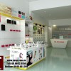Gỗ MDF phun sơn chính là vật liệu chính tạo nên nội thất shop điện thoại này. Tủ trưng bày điện thoại ơ giữa nhà rộng rãi, có ngăn tủ, bên ngoài được in tranh backlits và hình quảng cáo nổi bật.