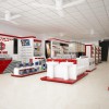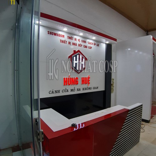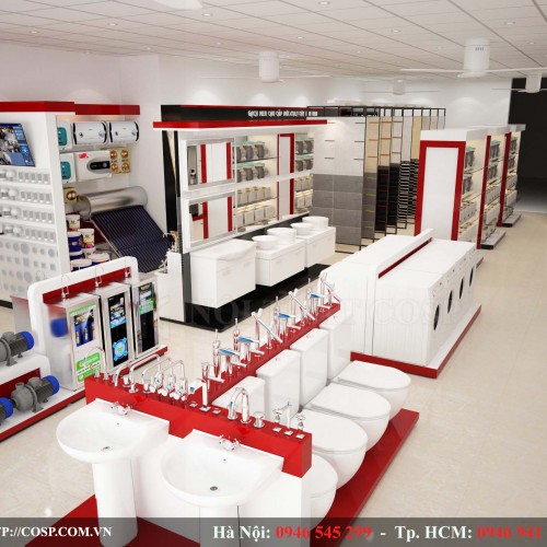 Gỗ mdf sơn 07 trắng và đỏ lên màu rất tươi vàn bóng đẹp. Các khu vực trưng bày được phân chia theo sản phẩm của anh Hùng. Khách hàng dễ dàng tìm thấy những thiết bị vệ sinh trong showroom.