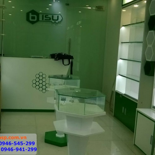 Shop được kết hợp với hệ thống kính cũng như đèn điện, giúp mang lại sự tươi sáng và lịch sự. Kệ trưng bày sản phẩm giữa nhà với thiết kế độc đáo và nhỏ nhắn, không những không chiếm nhiều diện tích mà còn là điểm nhấn cho cửa hàng. Chỉ trong thời gian ngắn, với đội ngũ nhân công giàu kinh nghiệm, tay nghề cao, chúng tôi đã hoàn thành shop cho anh Vũ theo những gì đã được thống nhất ở bản vẽ 3D