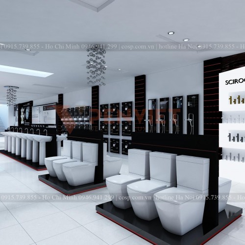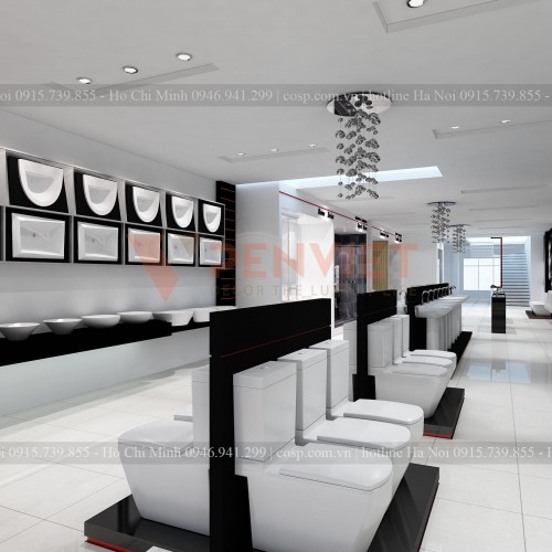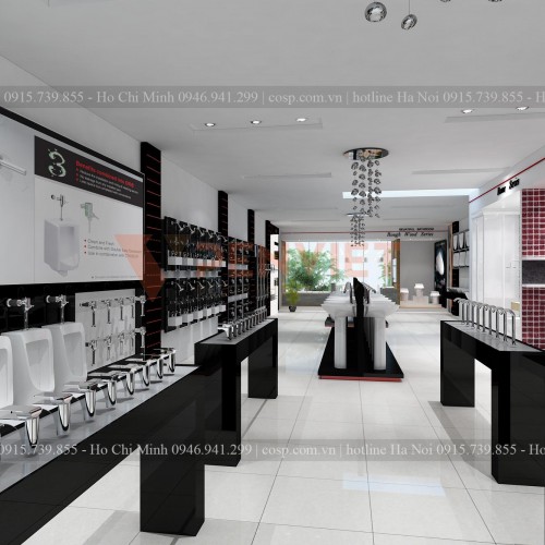 Thiết kế cửa hàng thiết bị vệ sinh COTTO sử dụng màu sắc chủ đạo là đen và trắng mang đến một thiết kế cửa hàng trẻ trung mà rất sang trọng và lịch lãm.