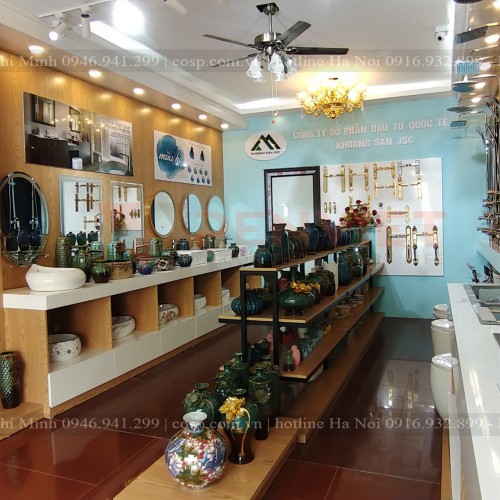 Cận cảnh thực tế khu vực trưng bày gốm sứ ở giữa của showroom Hải Đăng