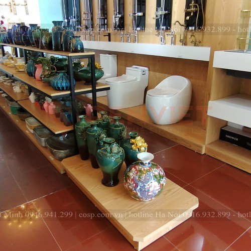 Tạo sự cân bằng về không gian. Kệ trưng bày gỗm sứ sử dụng khung sắt hộp sơn tĩnh điện vừa chắc chắn lại cân đối giúp cho việc bày biện và lựa chọn sp dễ dàng hơn!