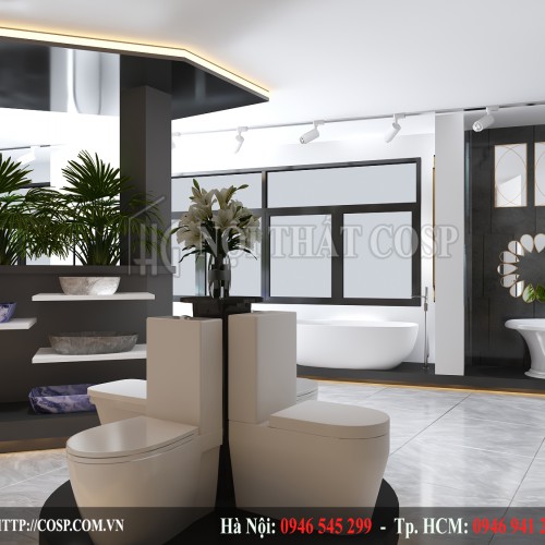 Thiết kế showroom thiết bị vệ sinh với tone màu chủ đạo là trắng và xám