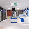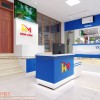 Khác với những thiết kế shop khác, cửa hàng không để quầy thu ngân ngay cửa ra vào, mà quầy thu ngân ở bên trong, và ở giữa hai bên là không gia trưng bày sản phẩm. Quầy sử dụng gỗ MDF lõi xanh chống ẩm phủ Melamive chống xước. Mặt trước của bàn và đằng sau quầy thu ngân, chúng tôi đã thiết kế bộ logo của shop. Bộ logo “HM HOA MAI” với 2 màu vàng và đỏ nổi bật trên nền trắng và xanh. Bộ chữa mica để nổi và không phát sáng.