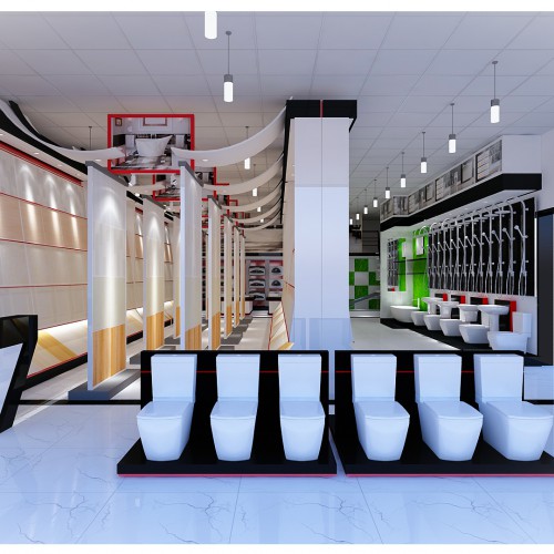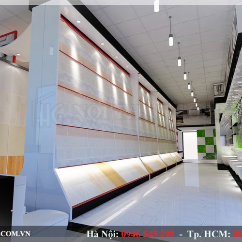 Không gian showroom đã được tô điểm thêm những gam màu nhẹ nhàng, gần gũi với khách hàng. Với những chất liệu như: màu trắng - đen- đỏ của mika, đèn led thanh.đèn dowlight hắt sang trong kệ gạch đã đem đến cho không gian nơi đây một không gian hoàn hảo về ánh sáng cũng như màu sắc.