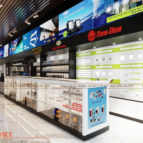 Các hệ vách trưng bày đèn Rạng Đông, thiết bị nhựa, trưng bày bơm, thiết bị thoát sàn được thiết kế là các kệ gỗ MDF lõi xanh chống ẩm phủ Melamine màu có sắt gia cố và hậu gỗ. Hệ tủ cánh mở có bản lề và tay nắm được gắn thêm phía dưới kệ để cất trữ đồ.