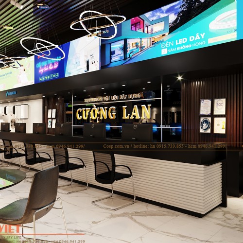 Bức vách logo phía sau quầy thu ngân được làm bằng PVC vân đá và ốp lam gỗ nhựa Planwood bên cạnh để tạo tính thẩm mỹ và sự nổi bật cho bức tường. Hệ chữ “ Cường Lan” và “ Showroom vật liệu xây dựng” với mặt alu vàng gương cùng chân phát sáng.