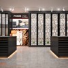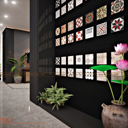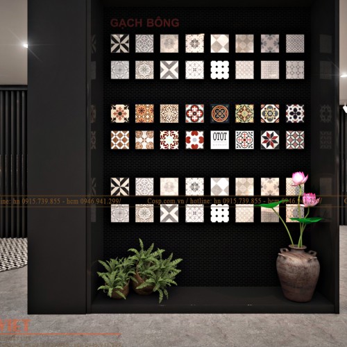 Với số lượng lớn mẫu mã sản phẩm gạch bông, chúng tôi đã đưa ra phương án trưng bày các mẫu nhỏ gắn trên các hệ tủ MDF giúp làm nổi bật sản phẩm hiệu quả và có thể dễ dàng tìm kiếm mã phù hợp.