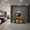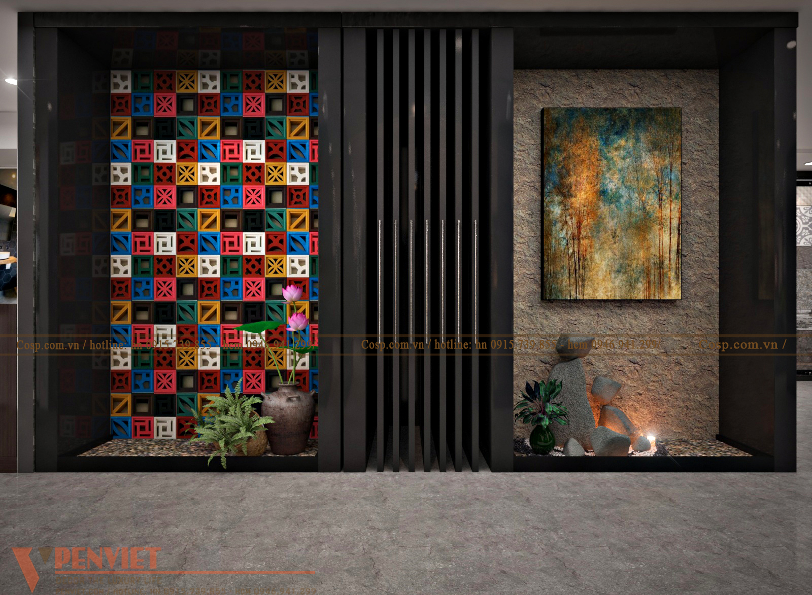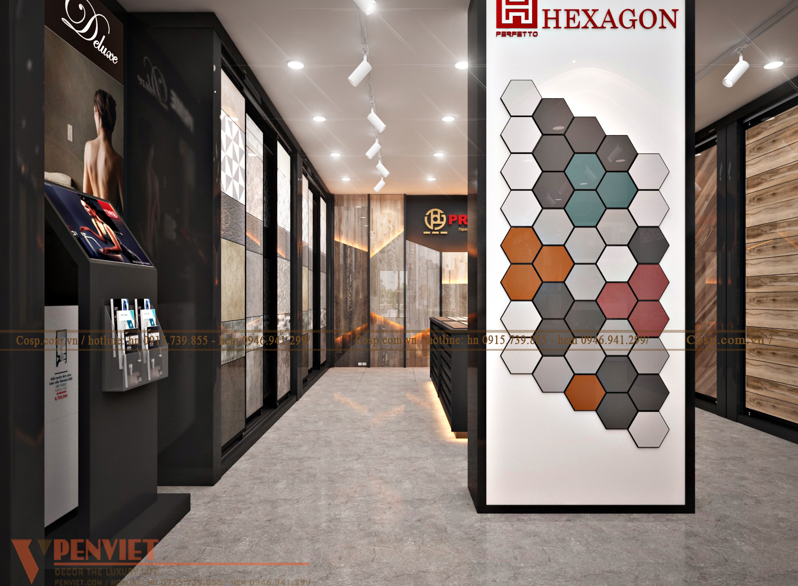 Để tiết kiệm không gian và tăng hiệu quả trang trí, Penviet đã thiết kế một khung cột dán gạch lục giác tại vị trí trung tâm. Chúng tôi đã sử dụng lợi thế của cửa hàng vật liệu xây dựng Oanh Lộc đó là có nhiều mẫu sản phẩm đẹp, độc quyền để tạo ra nét độc đáo mà không đối thủ cạnh tranh nào có được.