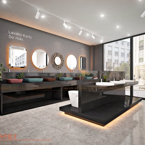 Bên cạnh những tủ sát tường, chúng tôi còn bố trí thêm hệ đảo trưng bày lavabo kết hợp bồn vệ sinh, bởi đây là những trang thiết bị không thể thiếu trong bất kỳ nhà tắm nào. Khu vực treo lavabo được kết hợp giữa sắt sơn tĩnh điện và gỗ MDF phủ laminate để đảm bảo sự chắc chắn và có tính thẩm mỹ đồng bộ. Dưới mỗi chân kệ đều có các gờ nội thất cùng đèn led, mang lại sự hiện đại cho thiết kế showroom vật liệu xây dựng Oanh Lộc.