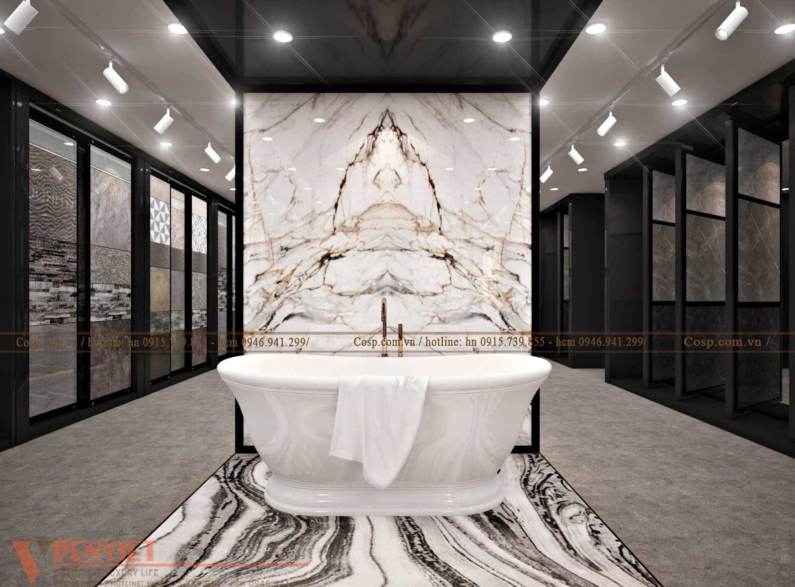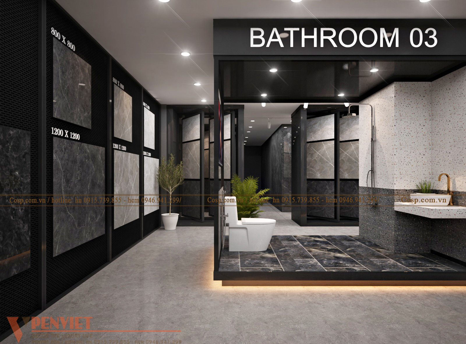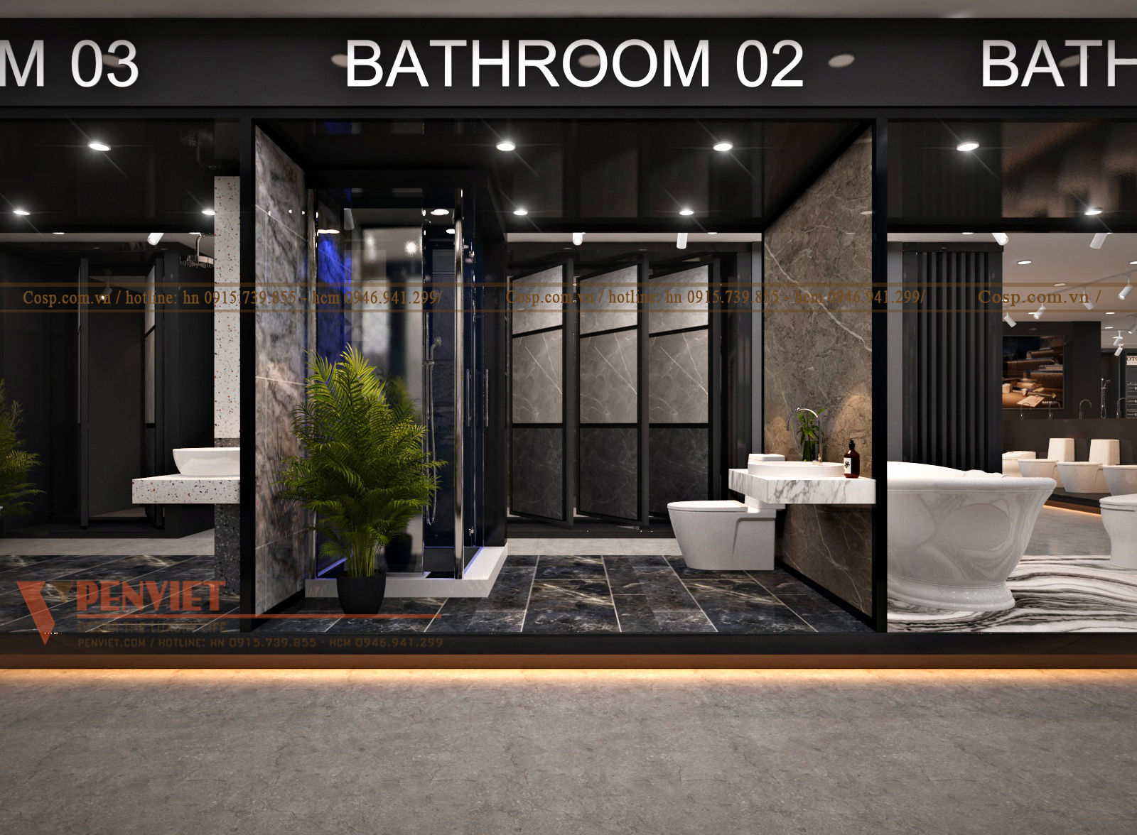 Phòng mẫu 01 lựa chọn gam màu trắng vân đá làm chủ đạo kết hợp những đường nét thiết kế hài hòa. Nó được trang bị bồn tắm, lavabo, gương, bồn vệ sinh,... đáp ứng yêu cầu của một phòng tắm sang trọng, hiện đại. Khu vực sàn được nâng cao lên so với mặt bằng chung để tạo sự nổi bật và phân biệt không gian này với các phần còn lại của cửa hàng.