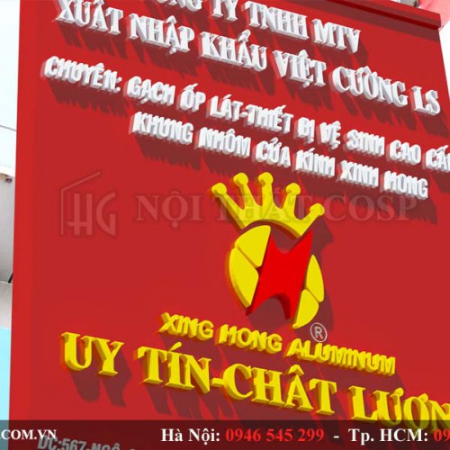 Thiết kế nội thất Showroom Vật liệu xây dựng với màu đỏ vàng theo tone màu của logo tạo nên sự nổi bật với không gian trưng bày sản phẩm. Thu hút khách hàng tới tham quan và trải nghiệm