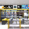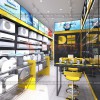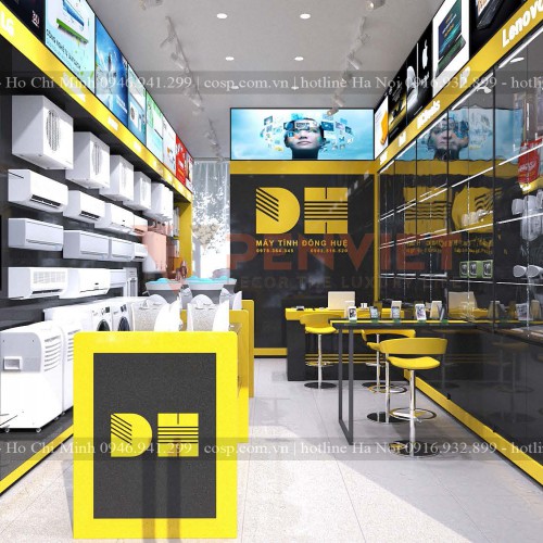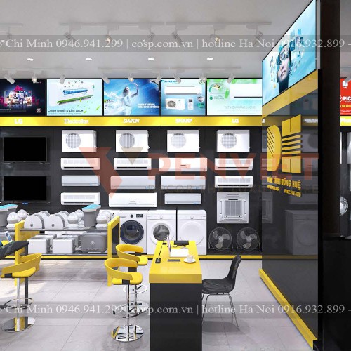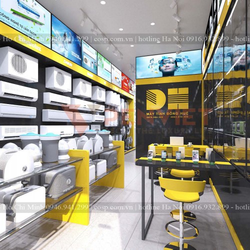 Nội thất cửa hàng điện máy thiết kế bởi hai tone màu vàng và đen đẹp nổi bật và sang trọng cuốn hút khách hàng khi bước chân vào bên trong cửa hàng. Màu sắc vàng và đen là 2 màu sắc tương phản nhưng sự phối hợp tinh tế đã mang lại không gian cực kỳ ấn tượng cho không gian kinh doanh và mua sắm.